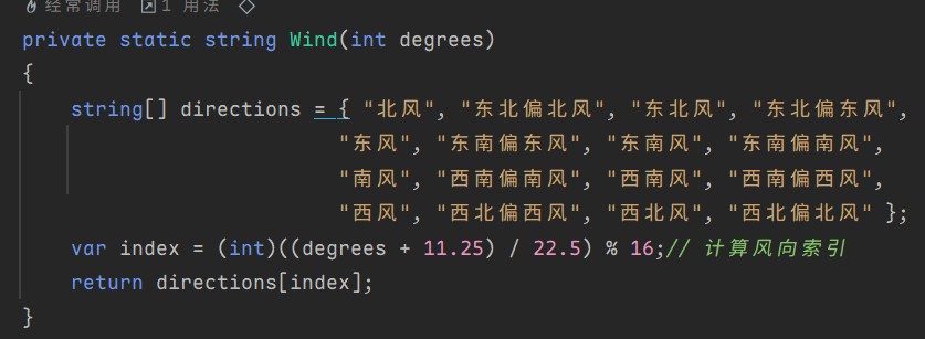 return directions[index];: 使用计算得到的 index 从 directions 数组中取出对应的风向字符串并返回。
